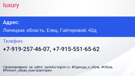 luxury по адресу Липецкая область, Елец, Гайтеровой, 42д в дальнейшем Организация, размещена в следующих категориях: