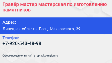 Гравёр-мастер, мастерская по изготовлению памятников по адресу Липецкая область, Елец, Маяковского, 39 в дальнейшем Организация, размещена в следующих категориях: