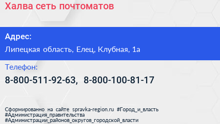 Халва, сеть почтоматов по адресу Липецкая область, Елец, Клубная, 1а в дальнейшем Организация, размещена в следующих категориях: