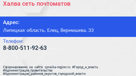 Халва, сеть почтоматов по адресу Липецкая область, Елец, Вермишева, 33 в дальнейшем Организация, размещена в следующих категориях: