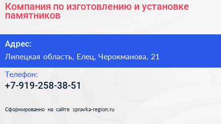 Компания по изготовлению и установке памятников по адресу Липецкая область, Елец, Черокманова, 21 в дальнейшем Организация, размещена в следующих категориях: