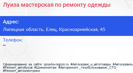 Луиза, мастерская по ремонту одежды по адресу Липецкая область, Елец, Красноармейская, 45 в дальнейшем Организация, размещена в следующих категориях: