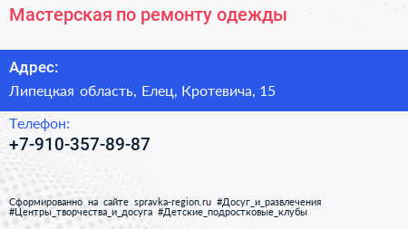 Мастерская по ремонту одежды по адресу Липецкая область, Елец, Кротевича, 15 в дальнейшем Организация, размещена в следующих категориях: