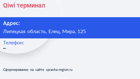 Qiwi, терминал по адресу Липецкая область, Елец, Мира, 125 в дальнейшем Организация, размещена в следующих категориях: