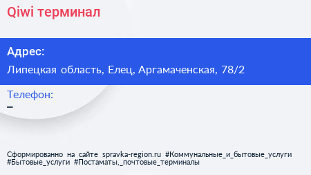 Qiwi, терминал по адресу Липецкая область, Елец, Аргамаченская, 78/2 в дальнейшем Организация, размещена в следующих категориях: