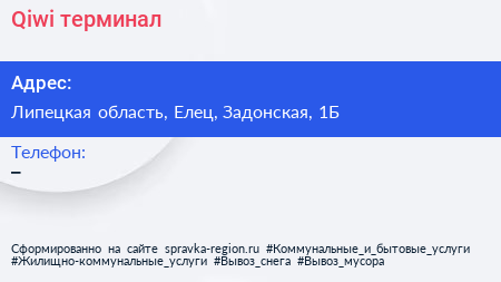 Qiwi, терминал по адресу Липецкая область, Елец, Задонская, 1Б в дальнейшем Организация, размещена в следующих категориях: