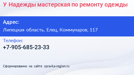 У Надежды, мастерская по ремонту одежды по адресу Липецкая область, Елец, Коммунаров, 117 в дальнейшем Организация, размещена в следующих категориях: