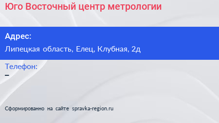 Юго-Восточный центр метрологии по адресу Липецкая область, Елец, Клубная, 2д в дальнейшем Организация, размещена в следующих категориях: