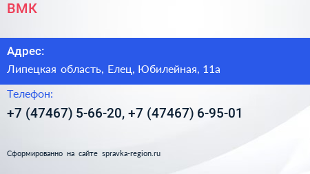 ВМК по адресу Липецкая область, Елец, Юбилейная, 11а в дальнейшем Организация, размещена в следующих категориях: