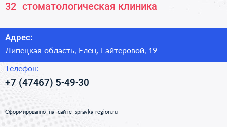 32+, стоматологическая клиника по адресу Липецкая область, Елец, Гайтеровой, 19 в дальнейшем Организация, размещена в следующих категориях: