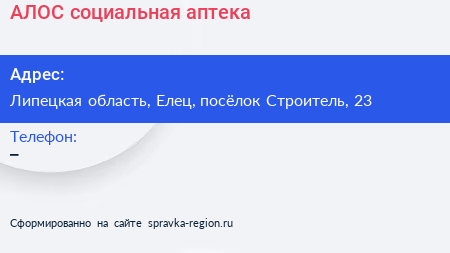 АЛОС, социальная аптека по адресу Липецкая область, Елец, посёлок Строитель, 23 в дальнейшем Организация, размещена в следующих категориях: