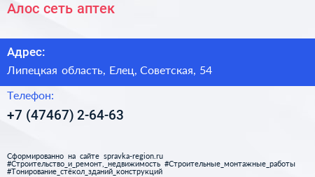 Алос, сеть аптек по адресу Липецкая область, Елец, Советская, 54 в дальнейшем Организация, размещена в следующих категориях: