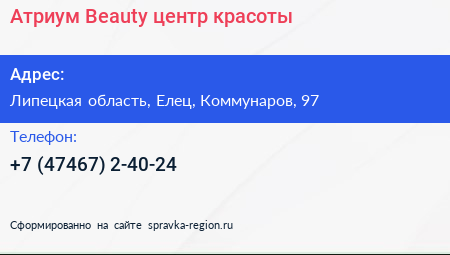 Атриум Beauty, центр красоты по адресу Липецкая область, Елец, Коммунаров, 97 в дальнейшем Организация, размещена в следующих категориях: