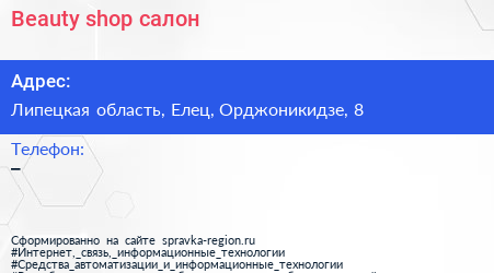 Beauty shop, салон по адресу Липецкая область, Елец, Орджоникидзе, 8 в дальнейшем Организация, размещена в следующих категориях: