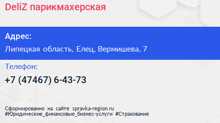 DeliZ, парикмахерская по адресу Липецкая область, Елец, Вермишева, 7 в дальнейшем Организация, размещена в следующих категориях: