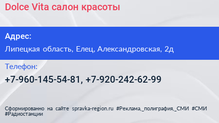 Dolce Vita, салон красоты по адресу Липецкая область, Елец, Александровская, 2д в дальнейшем Организация, размещена в следующих категориях: