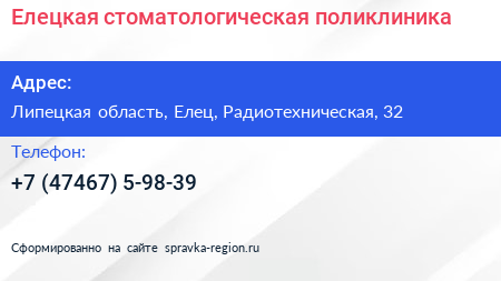 Елецкая стоматологическая поликлиника по адресу Липецкая область, Елец, Радиотехническая, 32 в дальнейшем Организация, размещена в следующих категориях: