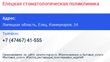 Елецкая стоматологическая поликлиника по адресу Липецкая область, Елец, Коммунаров, 14 в дальнейшем Организация, размещена в следующих категориях: