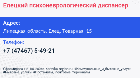 Елецкий психоневрологический диспансер по адресу Липецкая область, Елец, Товарная, 15 в дальнейшем Организация, размещена в следующих категориях: