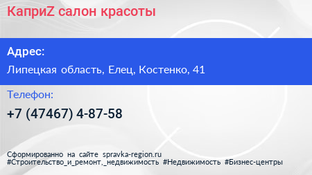 КаприZ, салон красоты по адресу Липецкая область, Елец, Костенко, 41 в дальнейшем Организация, размещена в следующих категориях: