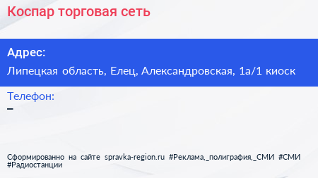 Коспар, торговая сеть по адресу Липецкая область, Елец, Александровская, 1а/1 киоск в дальнейшем Организация, размещена в следующих категориях: