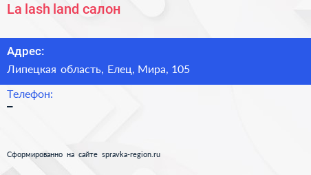 La-lash-land, салон по адресу Липецкая область, Елец, Мира, 105 в дальнейшем Организация, размещена в следующих категориях: