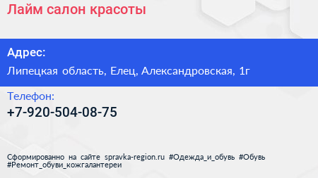 Лайм, салон красоты по адресу Липецкая область, Елец, Александровская, 1г в дальнейшем Организация, размещена в следующих категориях: