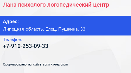 Лана, психолого-логопедический центр по адресу Липецкая область, Елец, Пушкина, 33 в дальнейшем Организация, размещена в следующих категориях: