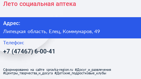 Лето, социальная аптека по адресу Липецкая область, Елец, Коммунаров, 49 в дальнейшем Организация, размещена в следующих категориях: