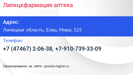 Липецкфармация, аптека по адресу Липецкая область, Елец, Мира, 123 в дальнейшем Организация, размещена в следующих категориях: