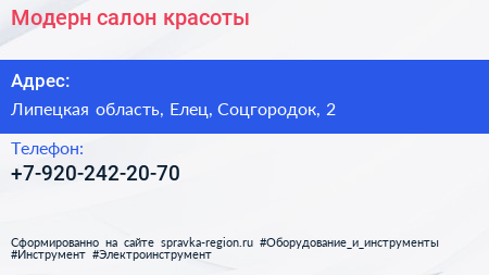 Модерн, салон красоты по адресу Липецкая область, Елец, Соцгородок, 2 в дальнейшем Организация, размещена в следующих категориях: