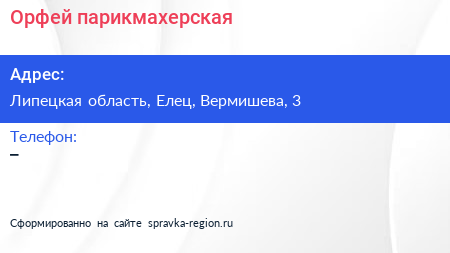Орфей, парикмахерская по адресу Липецкая область, Елец, Вермишева, 3 в дальнейшем Организация, размещена в следующих категориях:
