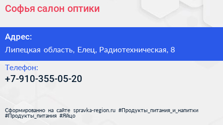 Софья, салон оптики по адресу Липецкая область, Елец, Радиотехническая, 8 в дальнейшем Организация, размещена в следующих категориях: