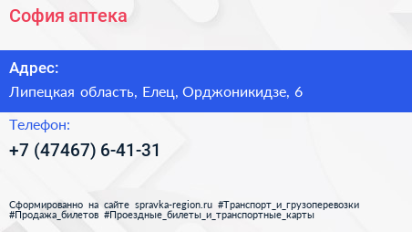 София, аптека по адресу Липецкая область, Елец, Орджоникидзе, 6 в дальнейшем Организация, размещена в следующих категориях: