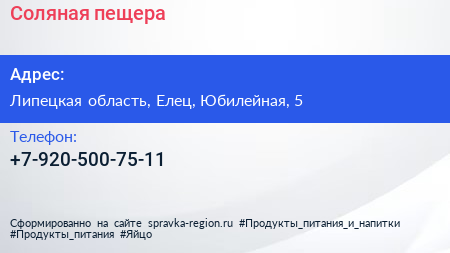 Соляная пещера по адресу Липецкая область, Елец, Юбилейная, 5 в дальнейшем Организация, размещена в следующих категориях: