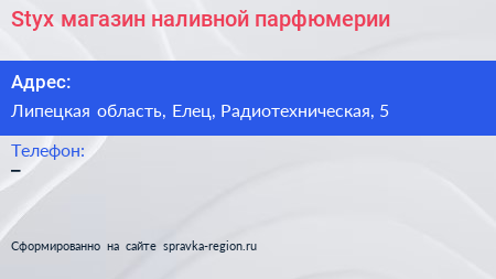 Styx, магазин наливной парфюмерии по адресу Липецкая область, Елец, Радиотехническая, 5 в дальнейшем Организация, размещена в следующих категориях: