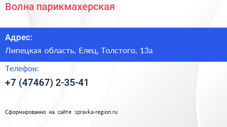 Волна, парикмахерская по адресу Липецкая область, Елец, Толстого, 13а в дальнейшем Организация, размещена в следующих категориях: