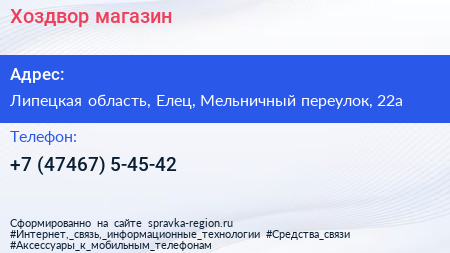 Хоздвор, магазин по адресу Липецкая область, Елец, Мельничный переулок, 22а в дальнейшем Организация, размещена в следующих категориях: