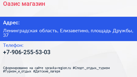 Оазис, магазин по адресу Ленинградская область, Елизаветино, площадь Дружбы, 37 в дальнейшем Организация, размещена в следующих категориях: