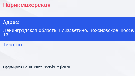 Парикмахерская по адресу Ленинградская область, Елизаветино, Вохоновское шоссе, 13 в дальнейшем Организация, размещена в следующих категориях: