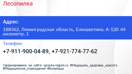 Лесопилка по адресу 188362, Ленинградская область, Елизаветино, А-120 44 километр, 1 в дальнейшем Организация, размещена в следующих категориях: