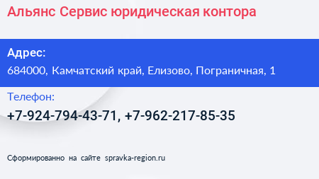 Альянс Сервис, юридическая контора по адресу 684000, Камчатский край, Елизово, Пограничная, 1 в дальнейшем Организация, размещена в следующих категориях: