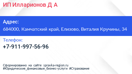 ИП Илларионов Д.А. по адресу 684000, Камчатский край, Елизово, Виталия Кручины, 34 в дальнейшем Организация, размещена в следующих категориях: