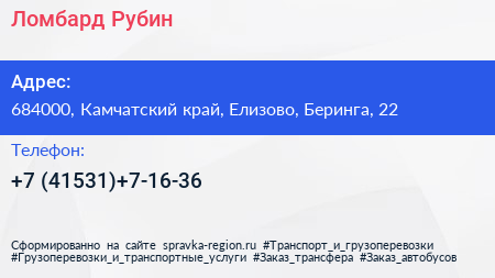 Ломбард Рубин по адресу 684000, Камчатский край, Елизово, Беринга, 22 в дальнейшем Организация, размещена в следующих категориях: