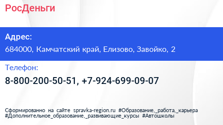 РосДеньги по адресу 684000, Камчатский край, Елизово, Завойко, 2 в дальнейшем Организация, размещена в следующих категориях: