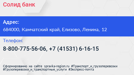Солид банк по адресу 684000, Камчатский край, Елизово, Ленина, 12 в дальнейшем Организация, размещена в следующих категориях: