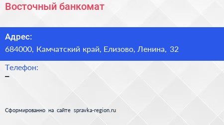 Восточный, банкомат по адресу 684000, Камчатский край, Елизово, Ленина, 32 в дальнейшем Организация, размещена в следующих категориях: