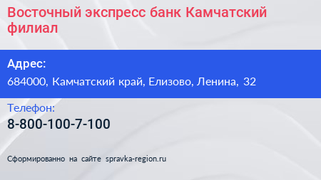 Восточный экспресс банк, Камчатский филиал по адресу 684000, Камчатский край, Елизово, Ленина, 32 в дальнейшем Организация, размещена в следующих категориях: