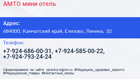 АМТО, мини-отель по адресу 684000, Камчатский край, Елизово, Ленина, 32 в дальнейшем Организация, размещена в следующих категориях: