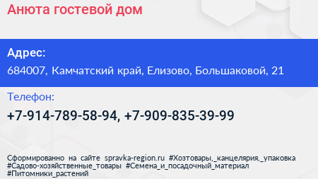 Анюта, гостевой дом по адресу 684007, Камчатский край, Елизово, Большаковой, 21 в дальнейшем Организация, размещена в следующих категориях: